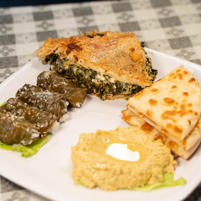 Spinach pie, stuffed grape leaves, hummus, and pita bread.