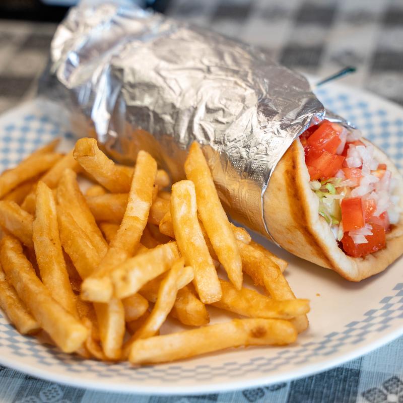 On pita with tzatziki sauce, lettuce, tomato & onion.