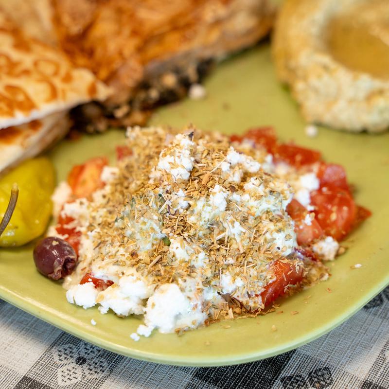 3 eggs with fresh garlic cooked in olive oil. Served with tomatoes, cucumbers, pepperoncini, feta salad & hummus sprinkled with olive oil and grilled pita.