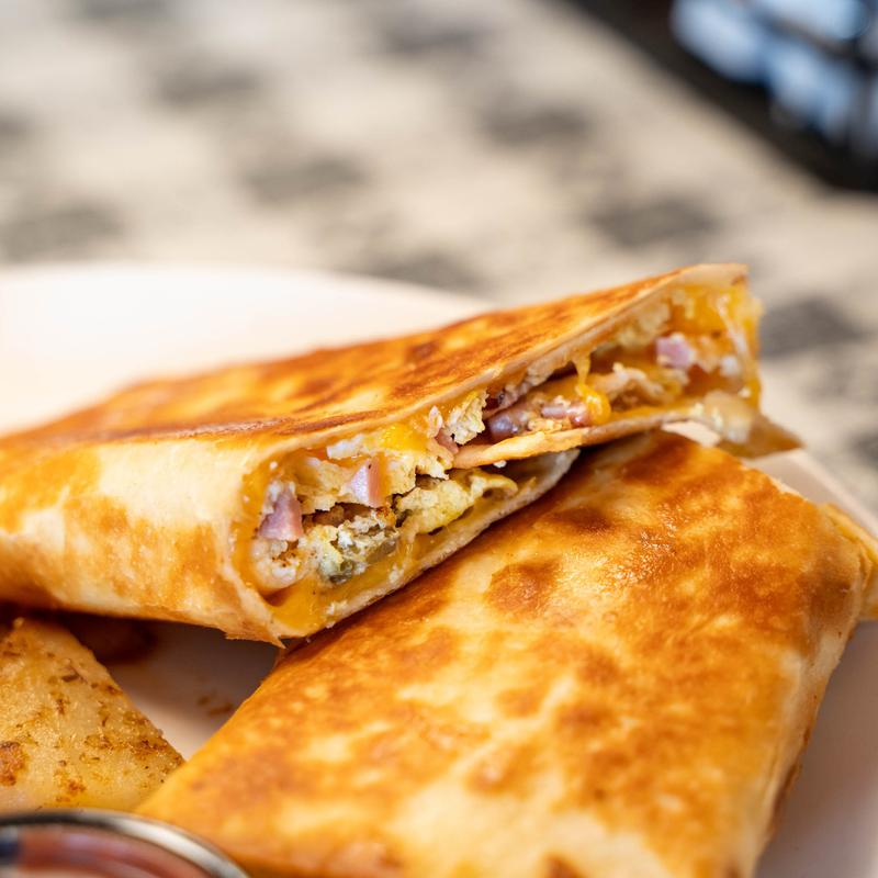Ham, bacon, sausage & cheddar jack cheese.