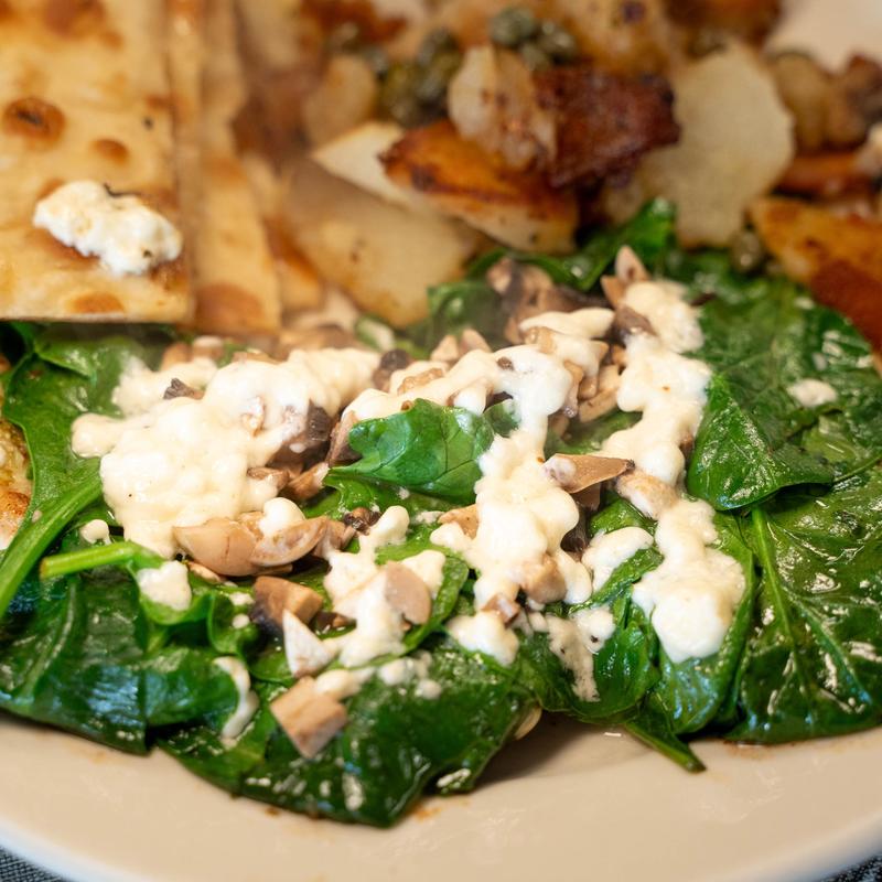 Fresh spinach, mushrooms & Swiss cheese cooked in olive oil.