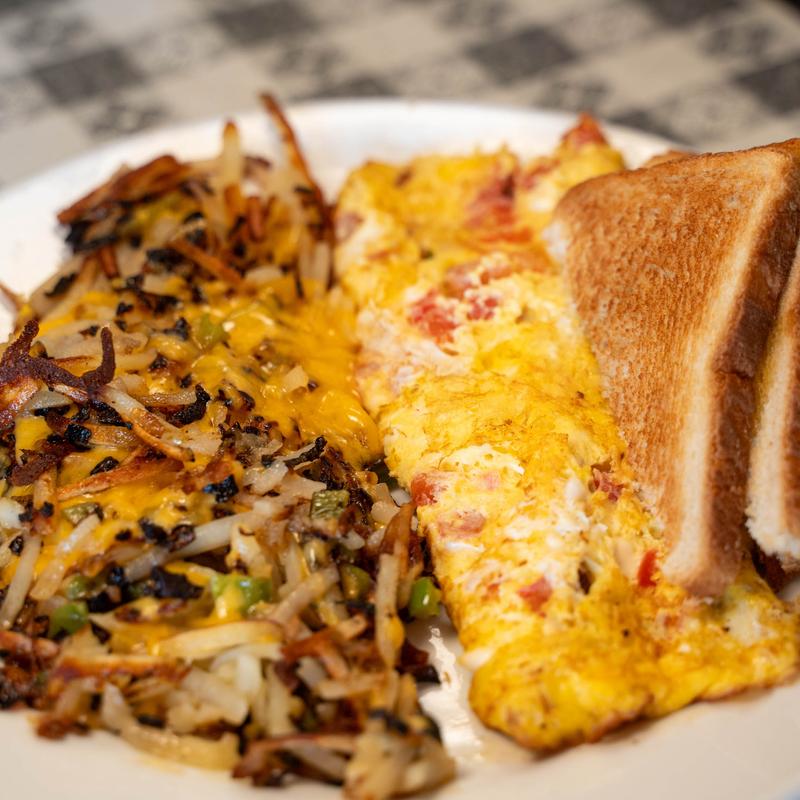 Eggs, onions, tomatoes & feta cheese served with Colonel's potatoes & toast.
